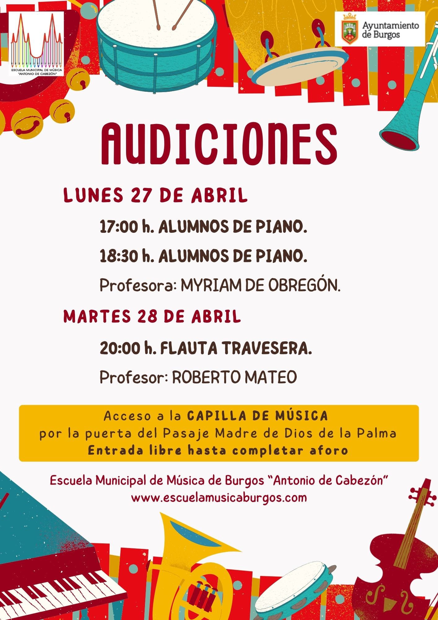 Curso 2025/2026 Audiciones 27 de abril de 2026 17:00 y 18:30 horas. Alumnos de Piano. Profesora Myriam de Obregón Audición 28 de abril de 2026 20:00 horas. Alumnos de Flauta Travesera. Profesor Roberto Mateo Puedes ver nuestros vídeos en el BLOG de la Escuela Municipal de Música de Burgos. BLOG EMM BURGOS Plan de estudiosmás info Especialidadesmás info Matriculaciónmás info